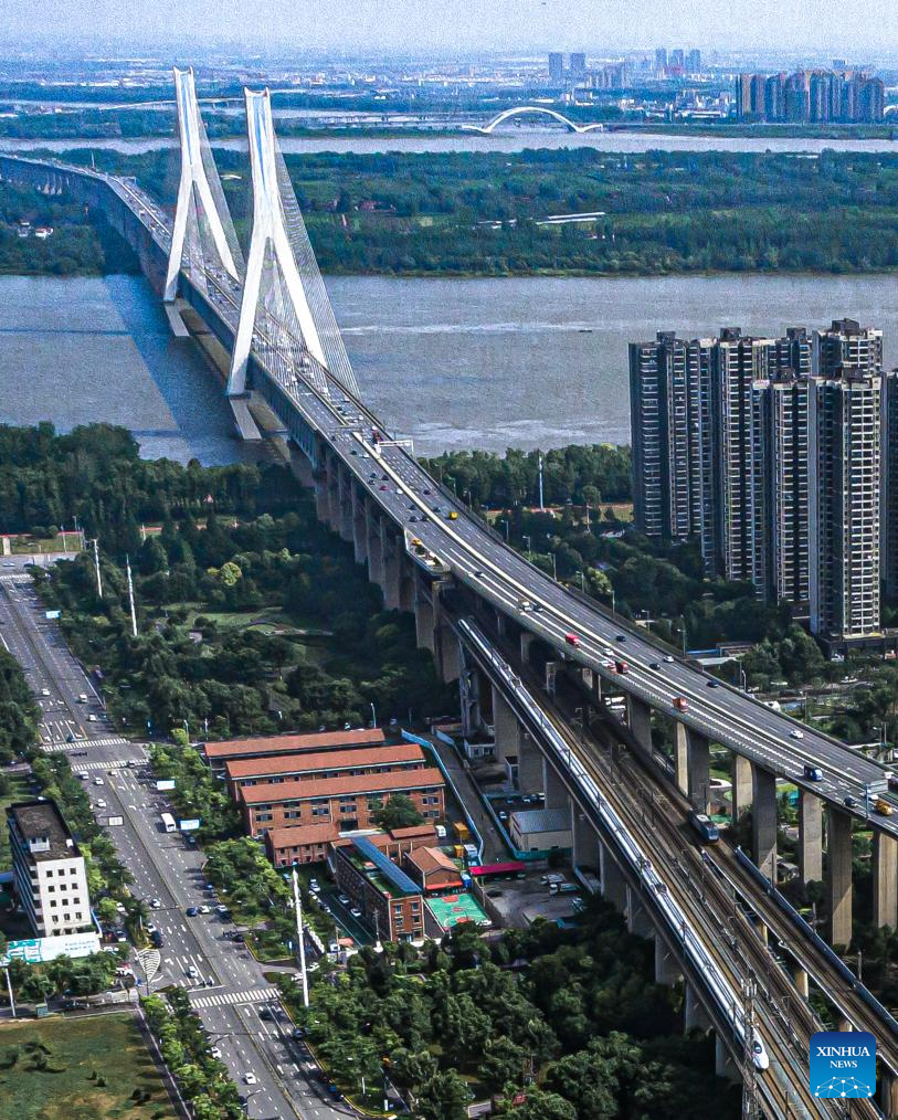 A drone photo taken on June 20, 2022 shows the Tianxingzhou Yangtze River Bridge in Wuhan, central China's Hubei Province. Currently, nearly 50 bridges have been completed or are under construction along the Yangtze River's Hubei section. [Photo/Xinhua]