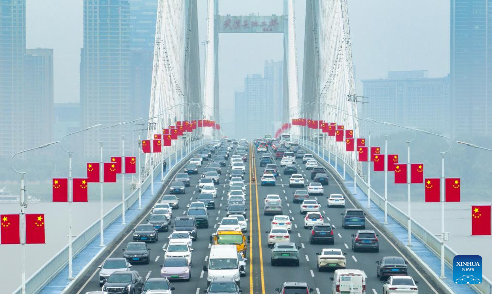 A drone photo taken on Oct. 1, 2025 shows vehicles passing across the Second Yangtze River Bridge in Wuhan, central China's Hubei Province. Currently, nearly 50 bridges have been completed or are under construction along the Yangtze River's Hubei section. [Photo/Xinhua]