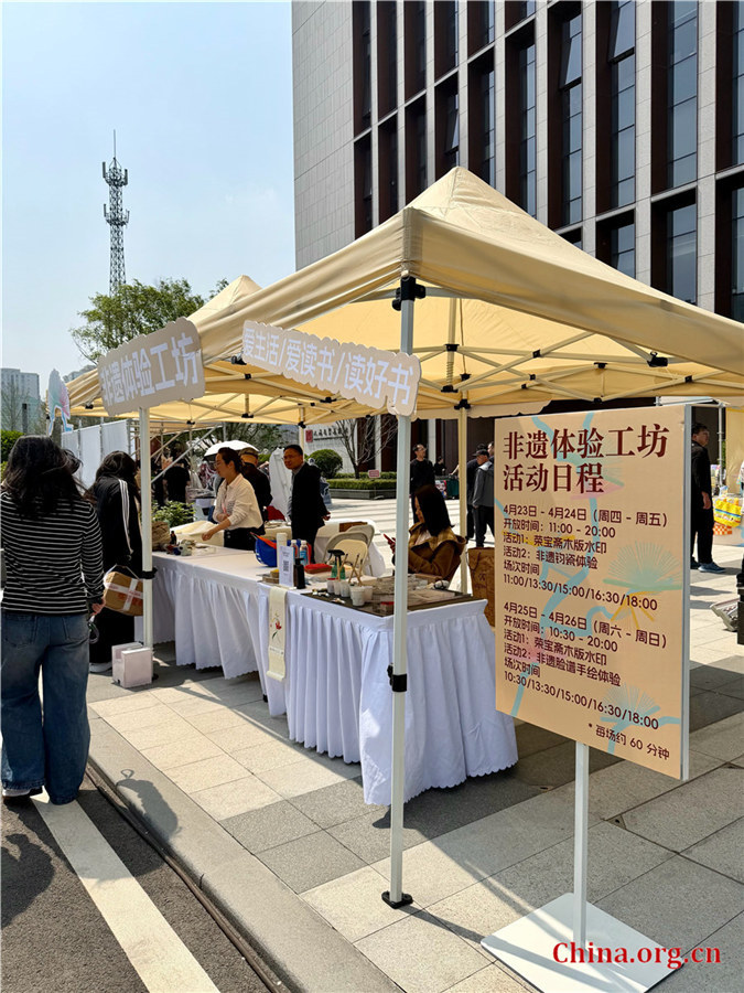 An intangible cultural heritage workshop booth displays activity schedules and hands-on experiences at the China Publishing Group Reading Week Cultural Market in Beijing, April 23, 2026. [Photo by Liu Caiyi/China.org.cn]