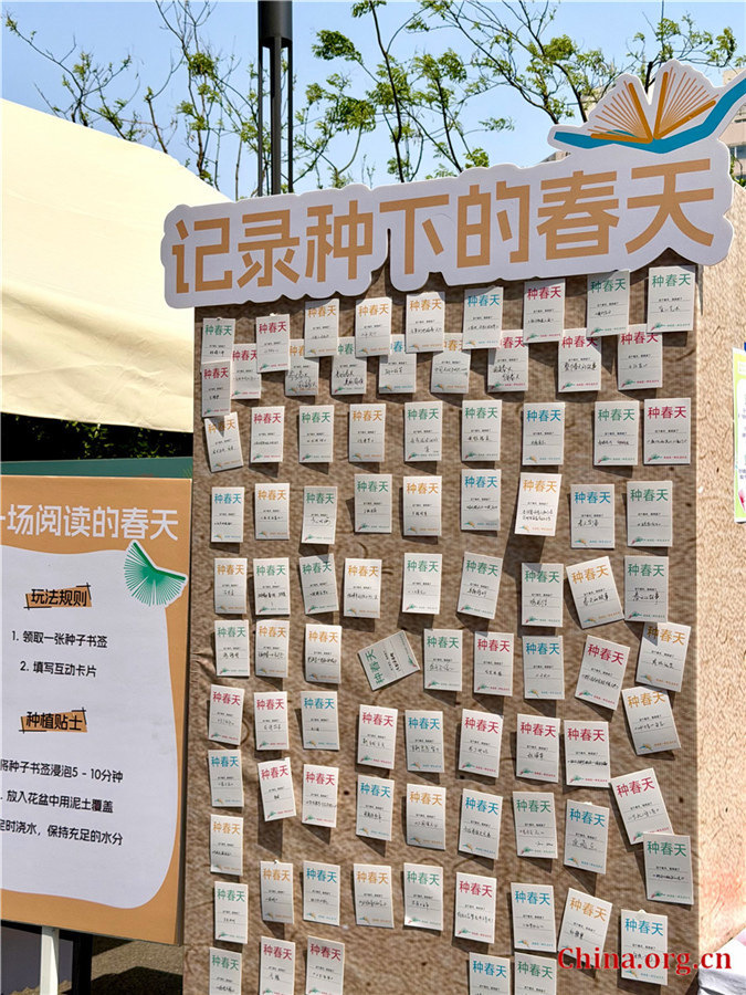 Handwritten notes left by visitors on an interactive message wall at the China Publishing Group Reading Week Cultural Market in Beijing, April 23, 2026. [Photo by Liu Caiyi/China.org.cn]