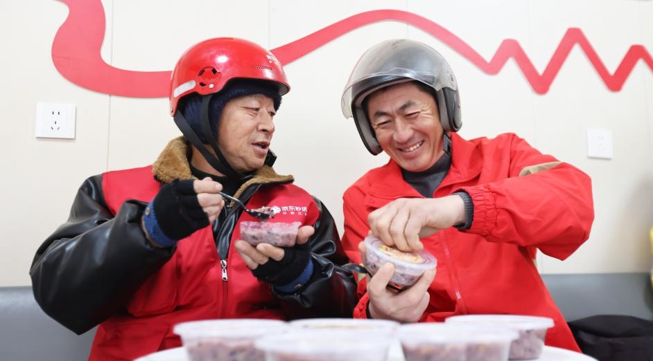 Food delivery riders taste Laba porridge presented by community volunteers at a courier station in Huzhou City, east China's Zhejiang province, Jan. 26, 2026. [Photo/Xinhua]