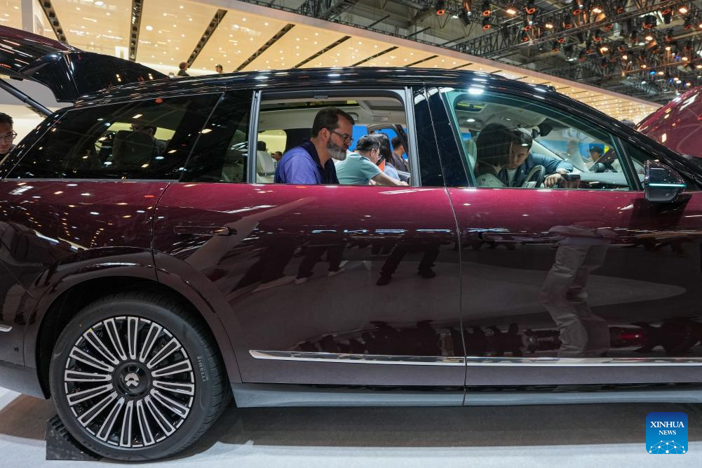 Visitors learn about a vehicle at the booth of NIO during the 2026 Beijing International Automotive Exhibition in Beijing, capital of China, April 26, 2026. (Xinhua/Ju Huanzong)