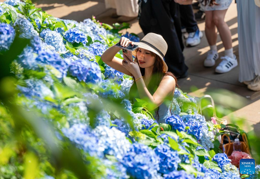 A tourist takes photos of flowers at the Qingxiu Mountain scenic area in Nanning, south China's Guangxi Zhuang Autonomous Region, April 25, 2026. (Photo by He Huawen/Xinhua)