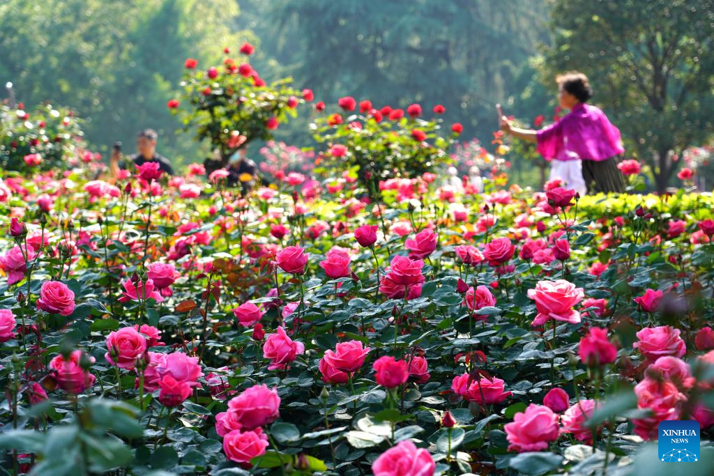People take pictures amid the Chinese Rose blossoms at a park in Hangzhou, east China's Zhejiang province, April 26, 2026. (Photo by Zhuang Yingchang/Xinhua)