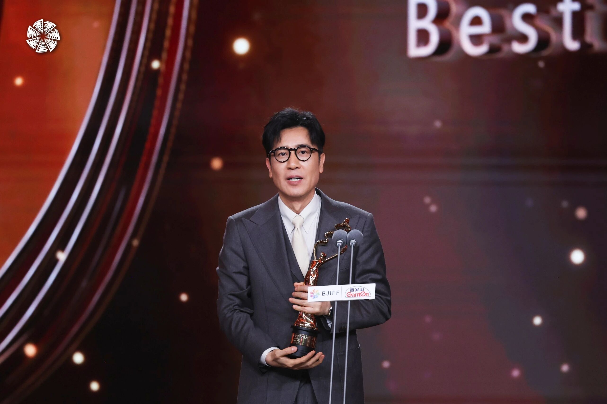 Yu Hewei accepts the best actor award at the 16th Beijing International Film Festival for his role in "All the Good Eyes" in Beijing, April 25, 2026. [Photo courtesy of the BJIFF Organizing Committee]