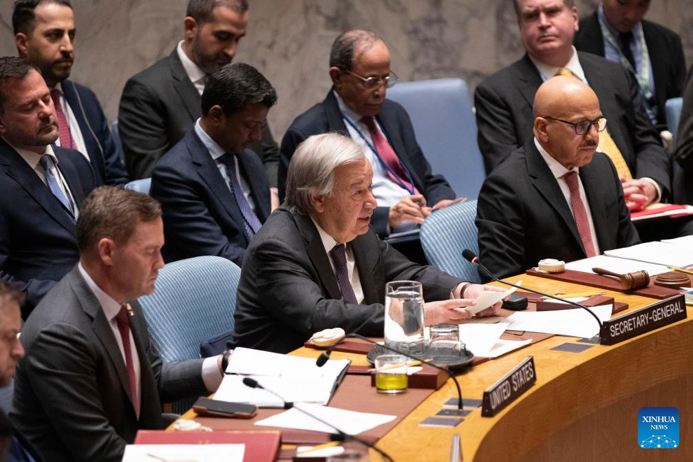 UN Secretary-General Antonio Guterres (C, front) speaks during the UN Security Council open debate on the safety and protection of waterways in the maritime domain, at the UN headquarters in New York, April 27, 2026. [Photo/Xinhua]