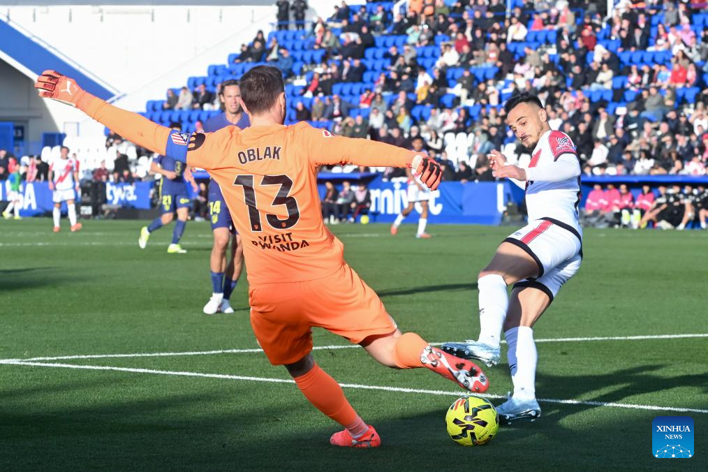 Alvaro Garcia (R) of Vallecano vies with Jan Oblak of Atletico de Madrid during the La Liga football match between Rayo Vallecano and Atletico de Madrid in Madrid, Spain, Feb. 15, 2026. (Photo by Gustavo Valiente/Xinhua)
