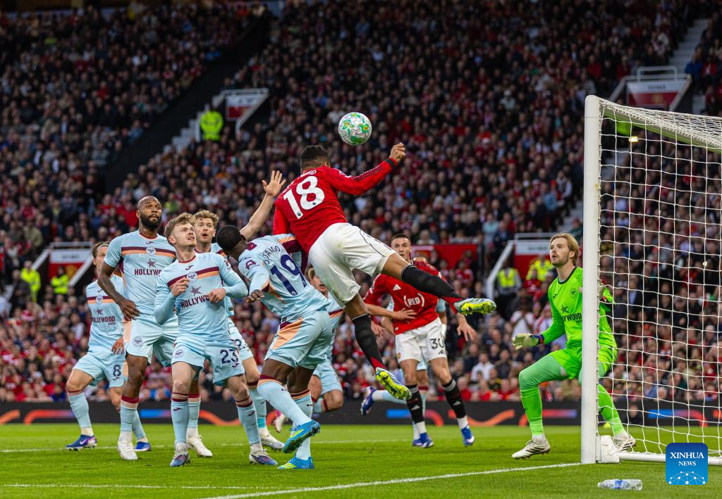 Manchester United's Casemiro (top) scores the opening goal during the English Premier League match between Manchester United FC and Brentford FC in Manchester, Britain, April 27, 2026. (Xinhua)