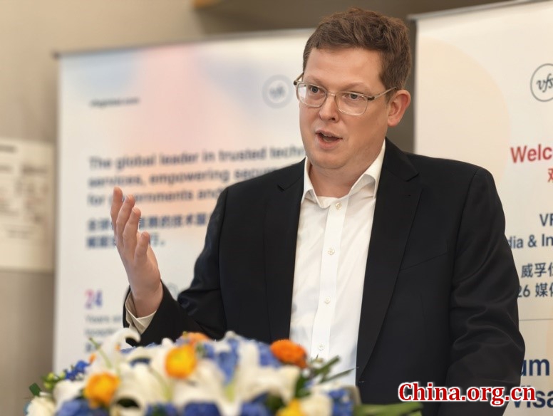 Simon Peachey, chief operating officer for China, Australasia and RCIS at VFS Global, speaks at a press event in Beijing, April 14, 2026. [Photo/China.org.cn]