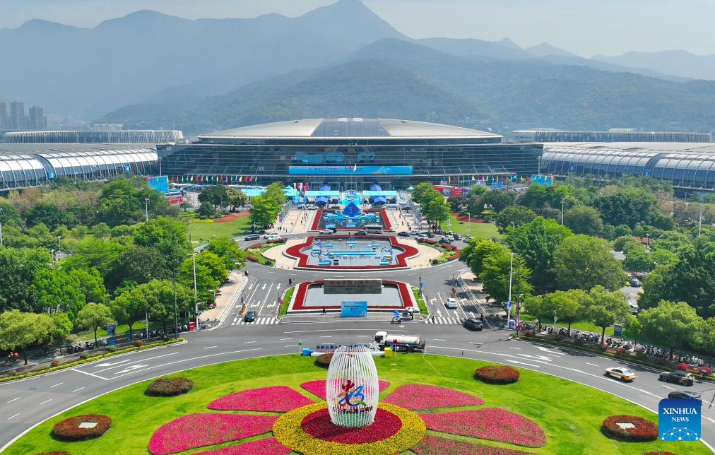 An aerial drone photo taken on April 28, 2026 shows Fuzhou Strait International Conference & Exhibition Center, Fuzhou, southeast China's Fujian Province. (Xinhua/Lin Shanchuan)