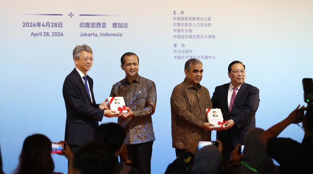 Copies of the English edition of the fifth volume of "Xi Jinping: The Governance of China" are presented to Indonesian guests at a promotional event in Jakarta, Indonesia, April 28, 2026. [Photo/Xinhua]