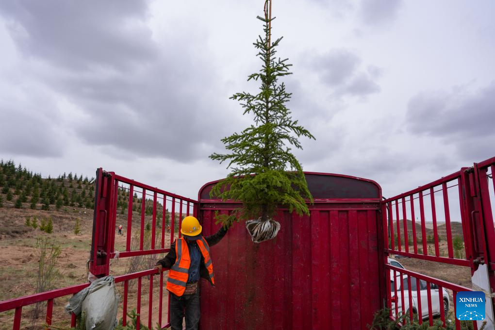 A drone lifts a sapling from a truck at a park in Lanzhou, northwest China's Gansu Province, April 27, 2026. (Xinhua/Lang Bingbing)