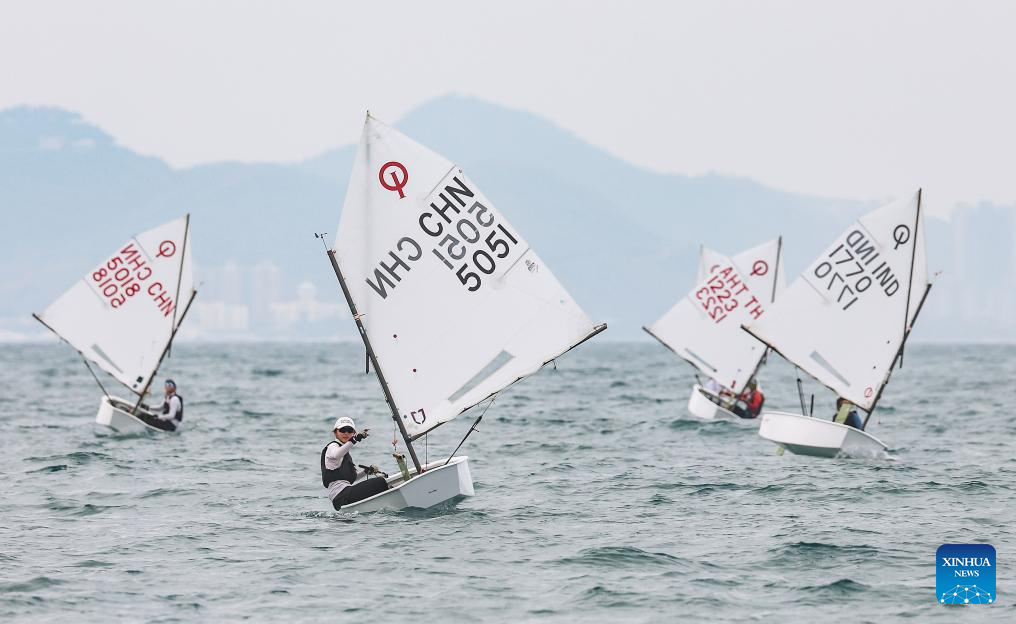 Cheng Wenyu (2nd L) of China competes during the Optimist Girls race of sailing at the 6th Asian Beach Games in Sanya, south China's Hainan Province, April 28, 2026. (Xinhua/Zhang Fan)