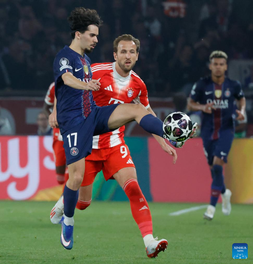 PSG's Vitinha (L) vies with Bayern Munich's Harry Kane during the UEFA Champions League semi-final first leg football match between Paris Saint-Germain (PSG) and Bayern Munich at the Parc des Princes in Paris, France, April 28, 2026. (Photo by Henri Szwarc/Xinhua)