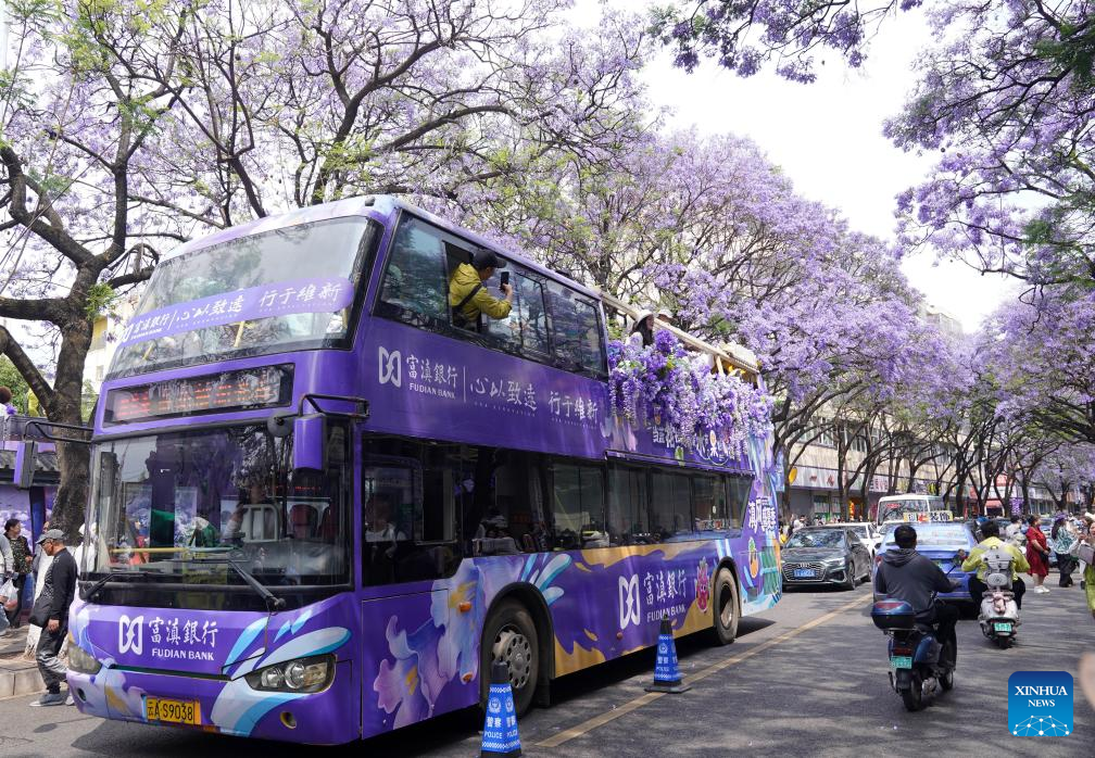 Tourists take a sightseeing bus to enjoy jacaranda blossoms in Kunming, southwest China's Yunnan province, April 26, 2026. (Photo by Liang Zhiqiang/Xinhua)