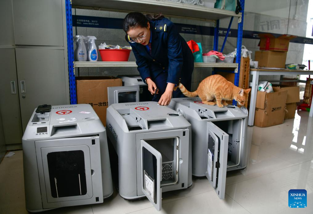 A staff member organizes smart pet transport cases at Guiyang North Railway Station in Guiyang, southwest China's Guizhou province, April 29, 2026. Ahead of the May Day holiday, demand for the newly introduced high-speed railway pet consignment services has surged. Railway operators nationwide are undertaking comprehensive service procedure optimizations and upgrades to the smart pet transport cases, ensuring strict physical separation between pets and passengers throughout the journey. Passengers can either travel with their pets or transport them separately, options that cater for diverse pet transport needs. (Xinhua/Yang Wenbin)