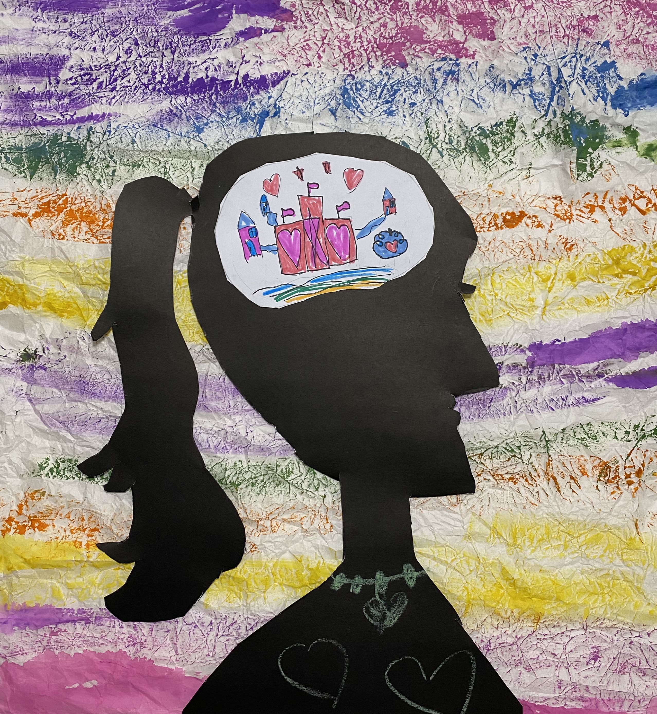 邵恩煊小朋友在主题为“爱在蓝天下——2022同一个未来”“点亮蓝灯”公益融合画展上展出了自己的作品《梦中的城堡》。[Catmint艺术工作室 供图]