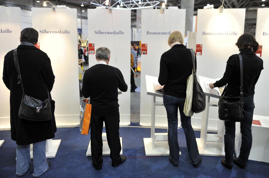 Visitors view books during the Leipzig Book Fair in Leipzig, Germany, March 15, 2012. The Leipzig Book Fair 2012 kicked off Thursday in Germany, attracting some 2071 exhibitors from 44 countries and regions. [Xinhua] |