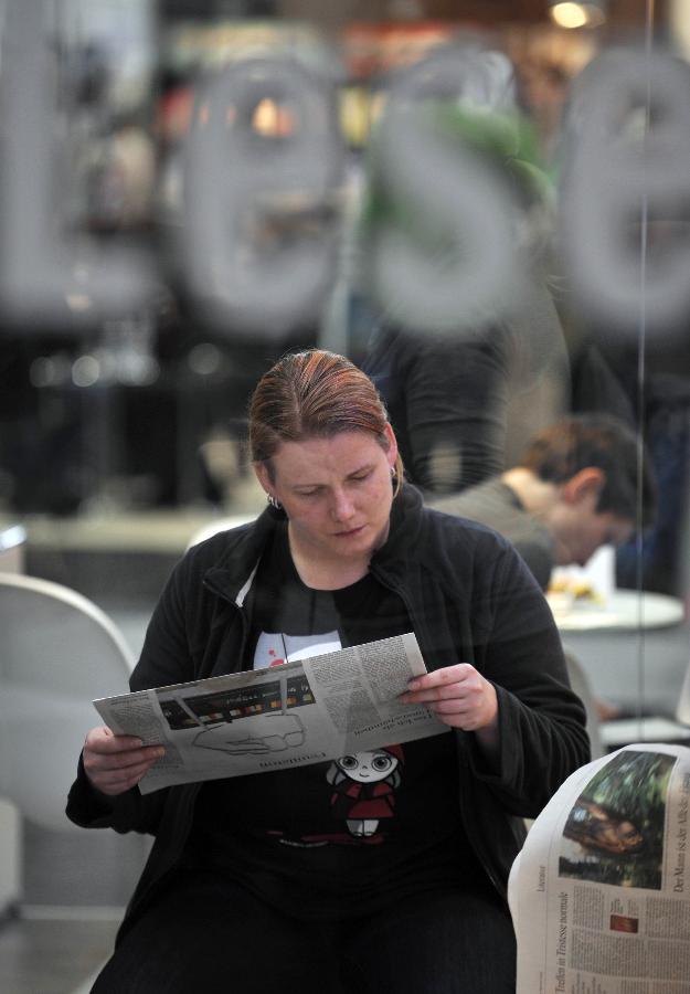 A visitor reads newspaper during the Leipzig Book Fair in Leipzig, Germany, March 15, 2012. The Leipzig Book Fair 2012 kicked off Thursday in Germany, attracting some 2071 exhibitors from 44 countries and regions. [Xinhua] |