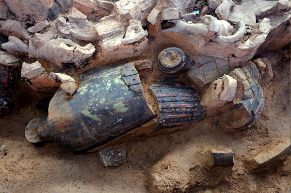 Photo taken on June 9, 2012 shows the newly unearthed terracotta warrior which was painted with colors at the No. 1 pit of the Museum of Qin Shihuang Terracotta Warriors and Horses in Xi'an, capital of northwest China's Shaanxi Province. Since the third excavation started in June of 2009, more than 100 terracotta warriors as well as terracotta horses and chariots have been unearthed at the No. 1 pit within the mausoleum complex of Qin Shihuang (259-210 BC), the founder of China's first unified feudal empire, the Qin Dynasty (221-206 BC).