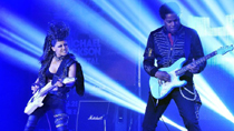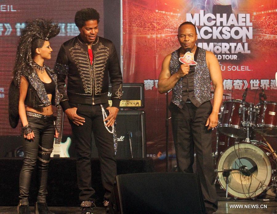 Jonathan Moffett (R), the drummer who has worked with Michael Jackson for more than 30 years, introduces the anecdotes with Michael Jackson during their cooperation on a press conference for the Michael Jackson The Immortal World Tour in Taipei, southeast China's Taiwan, June 18, 2013. The world tour concert will be held in the Taipei Arena from June 28 to June 30, and will be held in Beijing, Shanghai and Hong Kong in August. (Xinhua/Wu Ching-teng) |