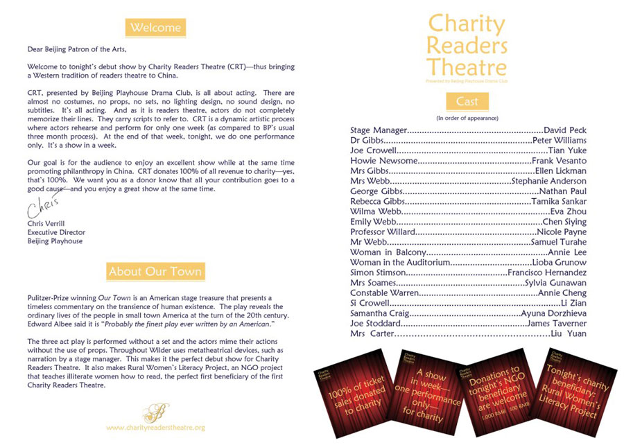 E-mail China.org.cn, November 13, 2013| The show "Our Town" was staged on November 9, 2013, produced by Charity Readers Theatre and presented by Beijing Playhouse Drama Club. The theatre will donate 100% of all ticket sales to Rural Women's Literacy Project. [China.org.cn] |