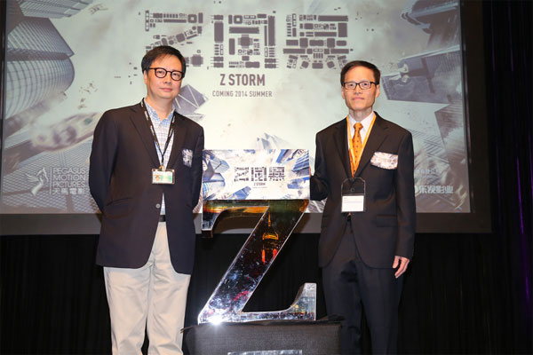 Director David Lam Tak-Luk (R) attends a press conference for his latest film, "Z Storm," in Hong Kong on March 24, 2014. [Photo: LeVP]