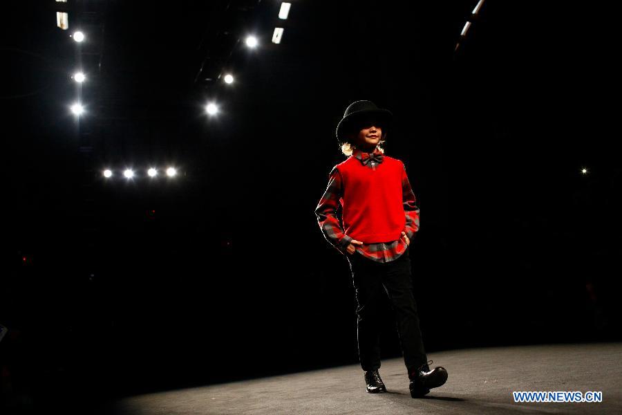 A child model presents a creation of CND By Condor during the 15th "080 Barcelona Fashion" in Barcelona, Spain, Feb. 3, 2015. (Xinhua/Pau Barrena)