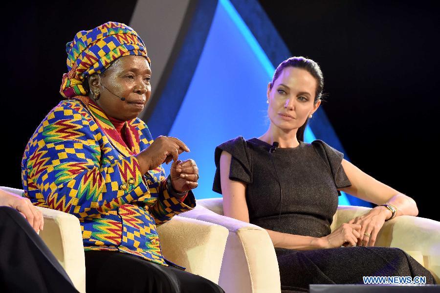 | Hollywood actress Angelina Jolie (R) speaks with African Union (AU) Commission Chairwoman Nkosazana Dlamini-Zuma at a panel discussion during the 25th AU Summit in Johannesburg, South Africa, on June 12, 2015. Hollywood actress Angelina Jolie, acting in her capacity as the United Nations envoy on refugee issues, on Friday called for an end to violence against women. [Xinhua] |