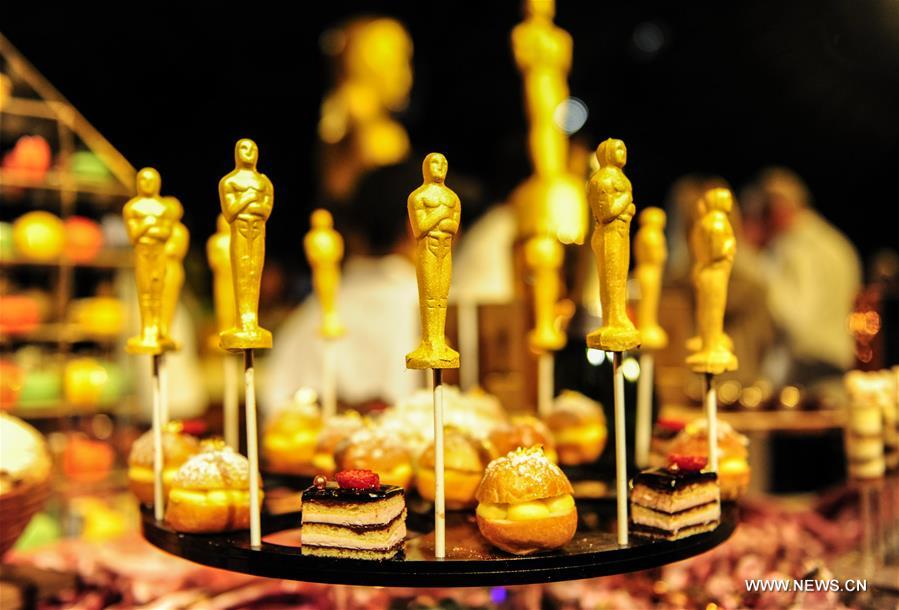 | 24-karat-gold chocolate Oscars are displayed at the 88th Academy Awards Governors Ball Press Preview in Los Angeles, United States, on Feb. 18, 2016. The 88th Academy Awards ceremony will be held at the Dolby Theatre in Los Angeles on Feb. 28. (Xinhua/Zhang Chaoqun) |