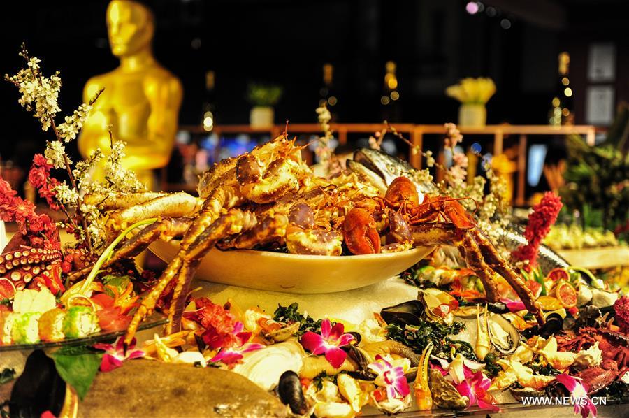 | Foods and Decorations are displayed at the 88th Academy Awards Governors Ball Press Preview in Los Angeles, United States, on Feb. 18, 2016. The 88th Academy Awards ceremony will be held at the Dolby Theatre in Los Angeles on Feb. 28. (Xinhua/Zhang Chaoqun) |