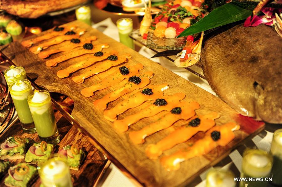 | Oscar shaped salmon appetizers are displayed at the 88th Academy Awards Governors Ball Press Preview in Los Angeles, United States, on Feb. 18, 2016. The 88th Academy Awards ceremony will be held at the Dolby Theatre in Los Angeles on Feb. 28. (Xinhua/Zhang Chaoqun) |