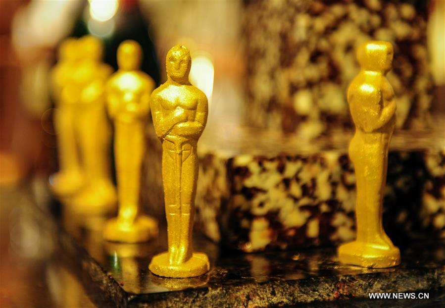 24-karat-gold chocolate Oscars are displayed at the 88th Academy Awards Governors Ball Press Preview in Los Angeles, United States, on Feb. 18, 2016. The 88th Academy Awards ceremony will be held at the Dolby Theatre in Los Angeles on Feb. 28. (Xinhua/Zhang Chaoqun)