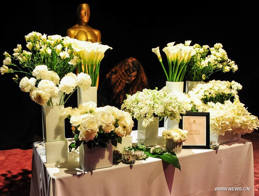 Flowers are displayed at the 88th Academy Awards Governors Ball Press Preview in Los Angeles, United States, on Feb. 18, 2016. The 88th Academy Awards ceremony will be held at the Dolby Theatre in Los Angeles on Feb. 28. (Xinhua/Zhang Chaoqun)