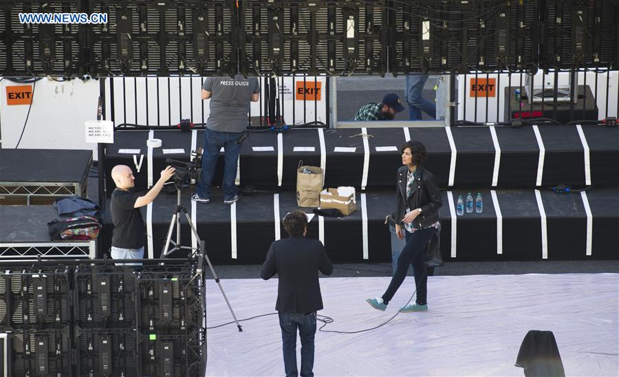 Media representatives make preparations for the 88th Academy Awards in Hollywood, Los Angeles, the United States, Feb. 24, 2016. The Academy Awards will be held on Feb. 28. (Xinhua/Yang Lei)