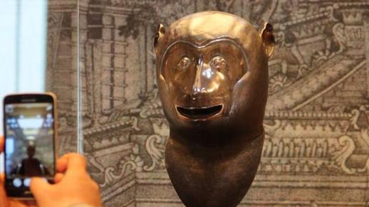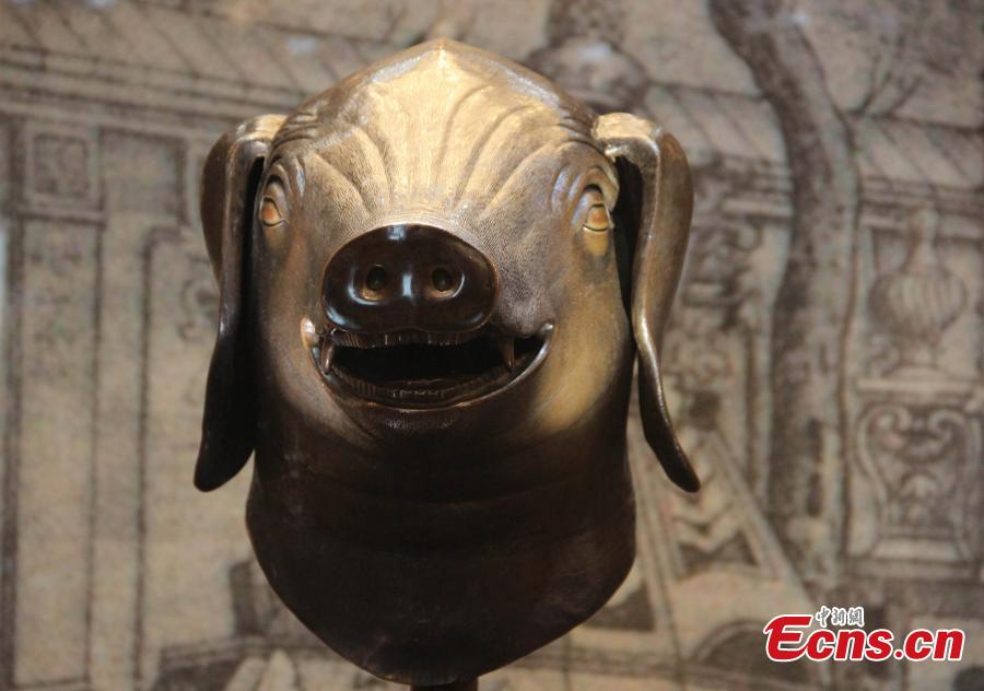 Visitors look at a bronze animal head on display at the Weinan Museum in Weinan city, Northwest China's Shaanxi province, Feb 29, 2016. More than 20,000 visitors in three days have come to view four bronze heads depicting an ox, tiger, monkey and pig from China's Yuanmingyuan or the Old Summer Palace in Beijing. [Photo/China News Service] |