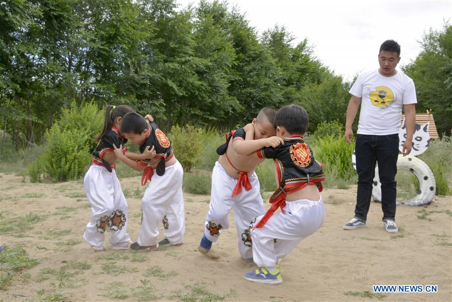 | Kids practice wrestling at a kindergarten of Urad Middle Banner in Bayan Nur City, north China's Inner Mongolia Autonomous Region, June 30, 2016. Courses of Matouqin, wrestling, archery and Mongolian dancing were set up in kindergartens and primary schools of Urad Middle Banner. (Xinhua/Zhi Maosheng) |