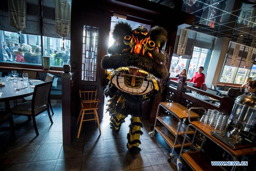 A dancing lion sends greetings to a Chinese restaurant in Helsinki, Finland, Feb. 15, 2018. The 12th "Happy Spring Festival - Helsinki Temple Fair" was held in Helsinki to celebrate the Chinese Lunar New Year. (Xinhua/Matti Matikainen)
