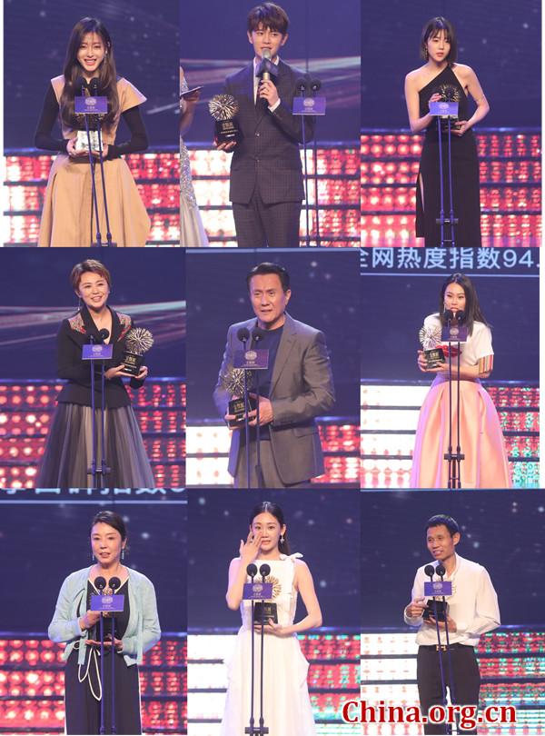 A combination of photos shows several celebrities, including Zhang Tian'ai, Ma Li and Yan Geling, receiving their awards at the gala of Golden Data Entertainment Award 2017-2018 held in Beijing, April 25, 2018. [Photo/China.org.cn]