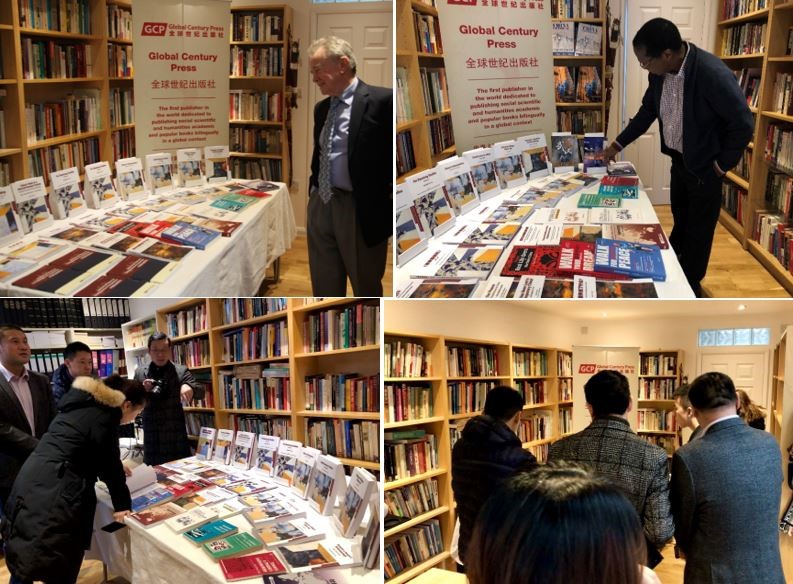 Professor Martin Albrow (top left), Mr. Mwika Nyangibo (accountant to the Global China Academy, top right), and visitors are inspecting the new books with interests.