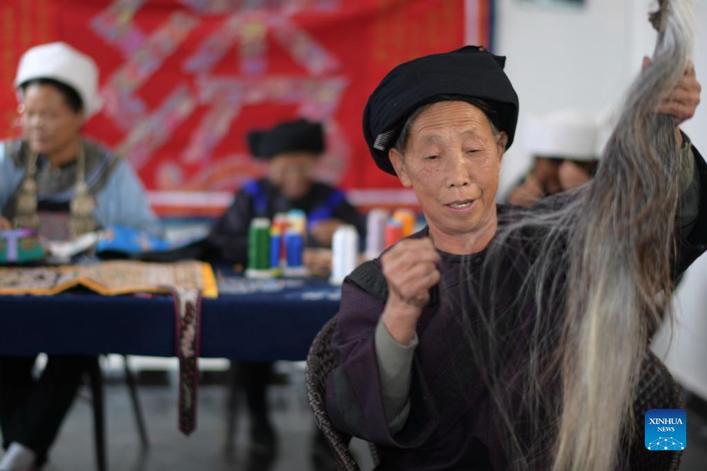 E-mail Xinhua, November 3, 2021An embroiderer of the Shui ethnic group makes sewing threads for the traditional horse tail embroidery with horse tail fibers and silk yarns in Xuehuahu relocation community of Zhonghe Township in Sandu Shui Autonomous County, southwest China's Guizhou Province, Nov. 2, 2021. Women in the community were trained as embroiderers of traditional horse tail embroidery to increase their income. (Xinhua/Yang Ying)