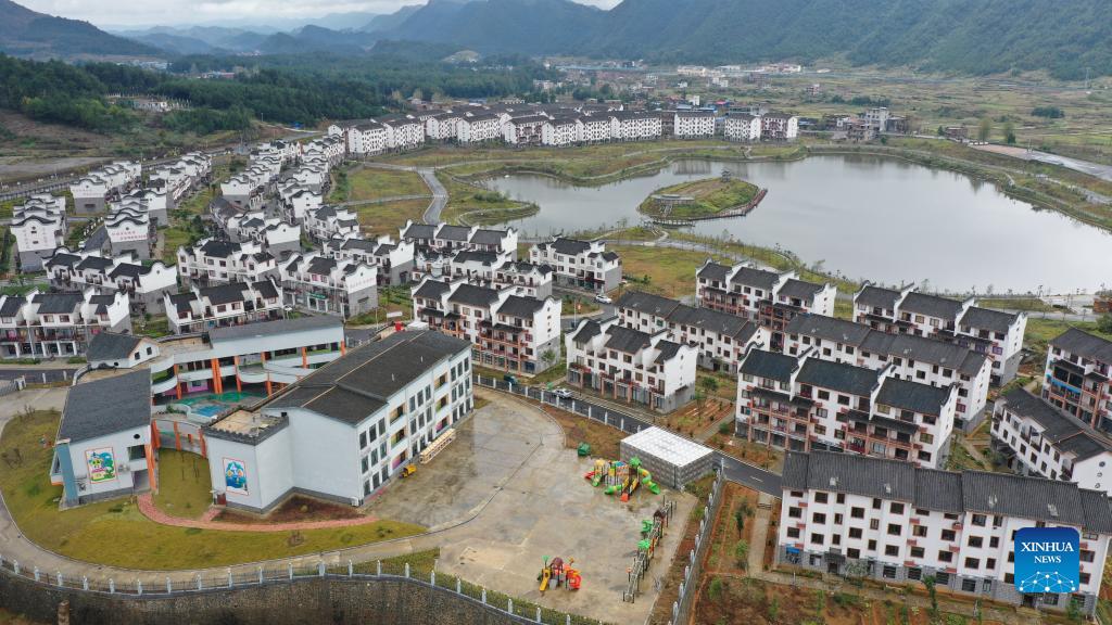 E-mail Xinhua, November 3, 2021Aerial photo taken on Nov. 2, 2021 shows Xuehuahu relocation community of Zhonghe Township in Sandu Shui Autonomous County, southwest China's Guizhou Province. Women in the community were trained as embroiderers of traditional horse tail embroidery to increase their income. (Xinhua/Yang Ying)