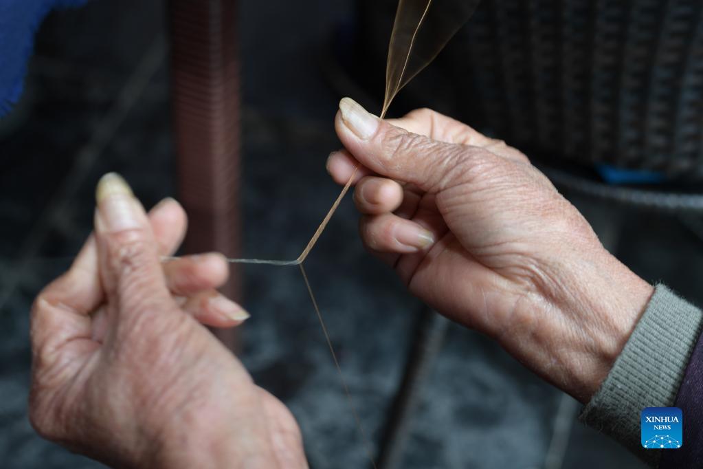 E-mail Xinhua, November 3, 2021An embroiderer of the Shui ethnic group makes sewing threads for the traditional horse tail embroidery with horse tail fibers and silk yarns in Xuehuahu relocation community of Zhonghe Township in Sandu Shui Autonomous County, southwest China's Guizhou Province, Nov. 2, 2021. Women in the community were trained as embroiderers of traditional horse tail embroidery to increase their income. (Xinhua/Yang Ying)