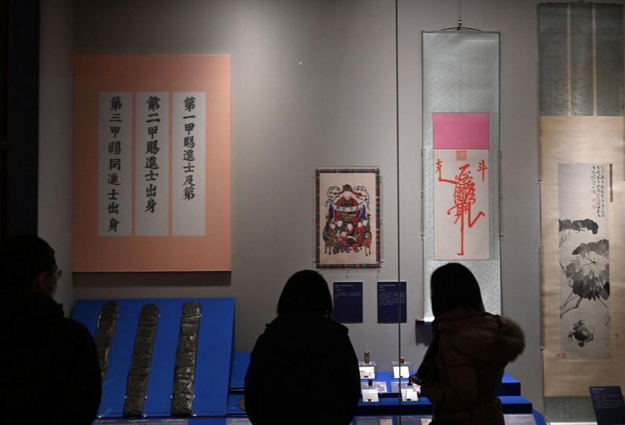 Visitors watch an exhibition at the Palace Museum in Beijing, capital of China, Jan. 16, 2023. (Xinhua/Jin Liangkuai)