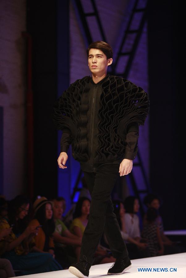 A model presents a creation during a fashion event showcasing works by graduates of the ESMOD (L'Ecole Superieure des Arts et Techniques de la Mode) Beijing, an international fashion institute, in Beijing, China, July 18, 2013. (Xinhua/Hou Dongtao) |