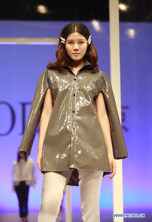A model presents a creation during a fashion event showcasing works by graduates of the ESMOD (L'Ecole Superieure des Arts et Techniques de la Mode) Beijing, an international fashion institute, in Beijing, China, July 18, 2013. (Xinhua/Hou Dongtao)