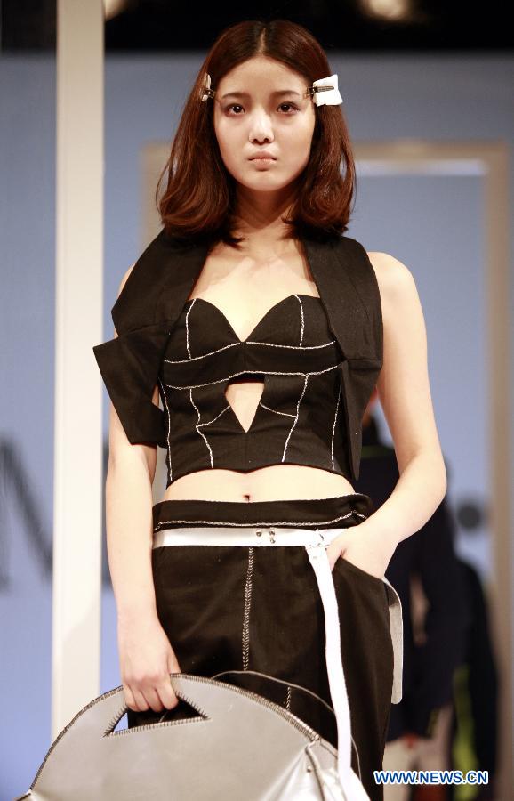 A model presents a creation during a fashion event showcasing works by graduates of the ESMOD Beijing, an international fashion institute, in Beijing, China, July 18, 2013. (Xinhua/Hou Dongtao)