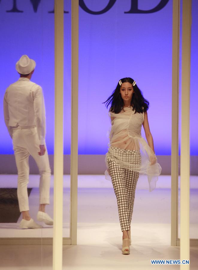 A model presents a creation during a fashion event showcasing works by graduates of the ESMOD Beijing, an international fashion institute, in Beijing, China, July 18, 2013. (Xinhua/Hou Dongtao)