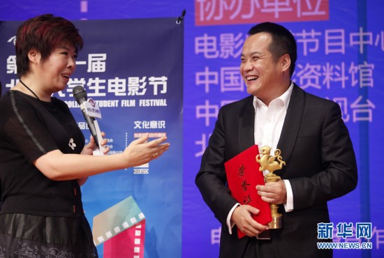Ning Hao (R), a Chinese film director, delivers his acceptance speech at the opening of the 21st Beijing College Student Film Festival (BCSFF) in Beijing on April 8, 2014. A total of 34 films will compete for the Jury Award of the film festival. The films include "Black Coal, Thin Ice," "No Man Land," "Unbeatable," "Police Story 2013," "So Young," "Beijing Love Story" and the Sino-French co-production "Nightingale" directed by Philippe Muyl. They were selected from more than 200 participating films. The event also awarded Feng Xiaogang, Zhang Yimou, Ning Hao, Huang Jianxin and Xie Fei as the top five Chinese film directors in the last twenty years [Photo from Xinhua]