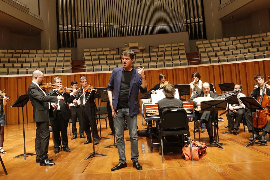 Philippe Jaroussky (C front), French countertenor singer, rehearses at the National Grand Theater in Beijing, capital of China, April 21, 2014. The "Philippe Jaroussky and Venice Baroque Orchestra Concert" held on Monday was Philippe's debut in China. A countertenor is a type of classical male singing voice whose vocal range is equivalent to that of the female soprano, mezzo-soprano voice types.[Photo/Xinhua] |